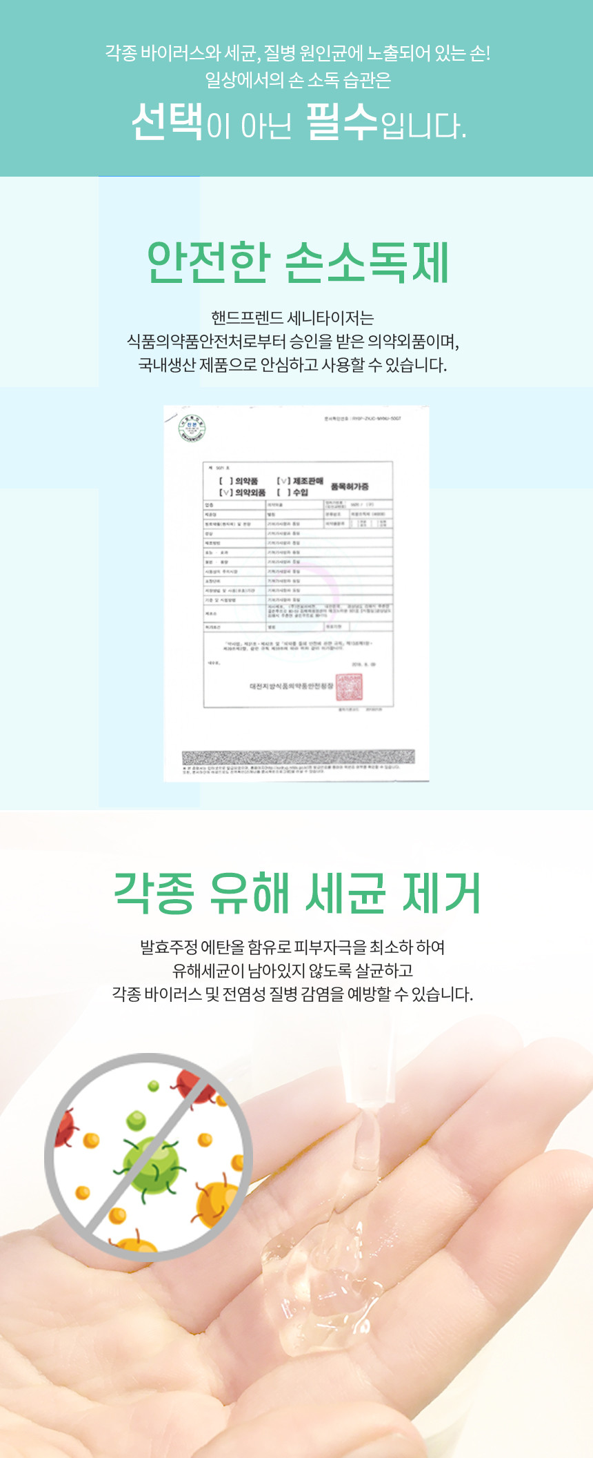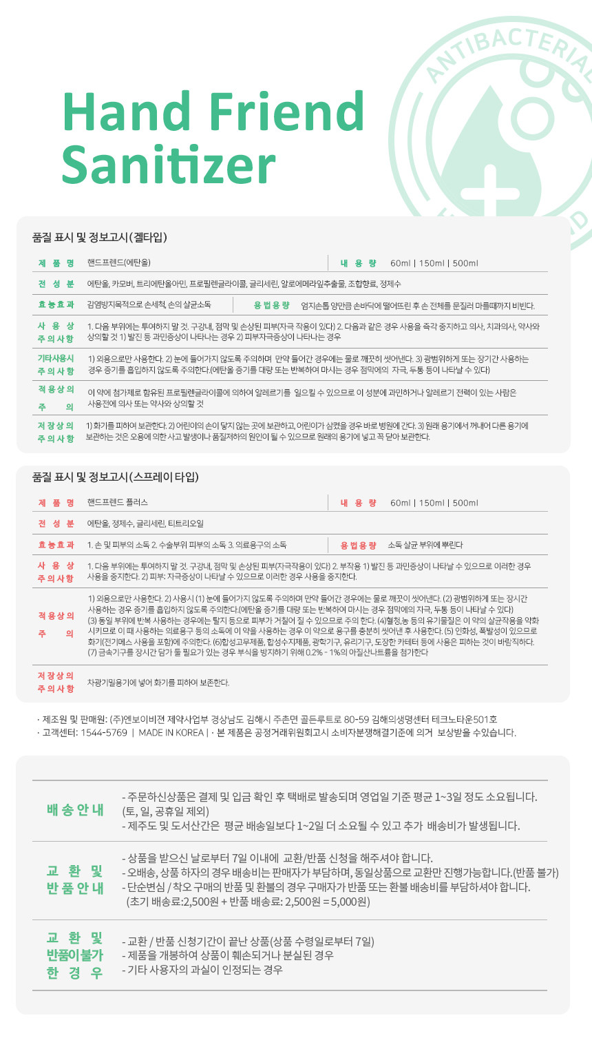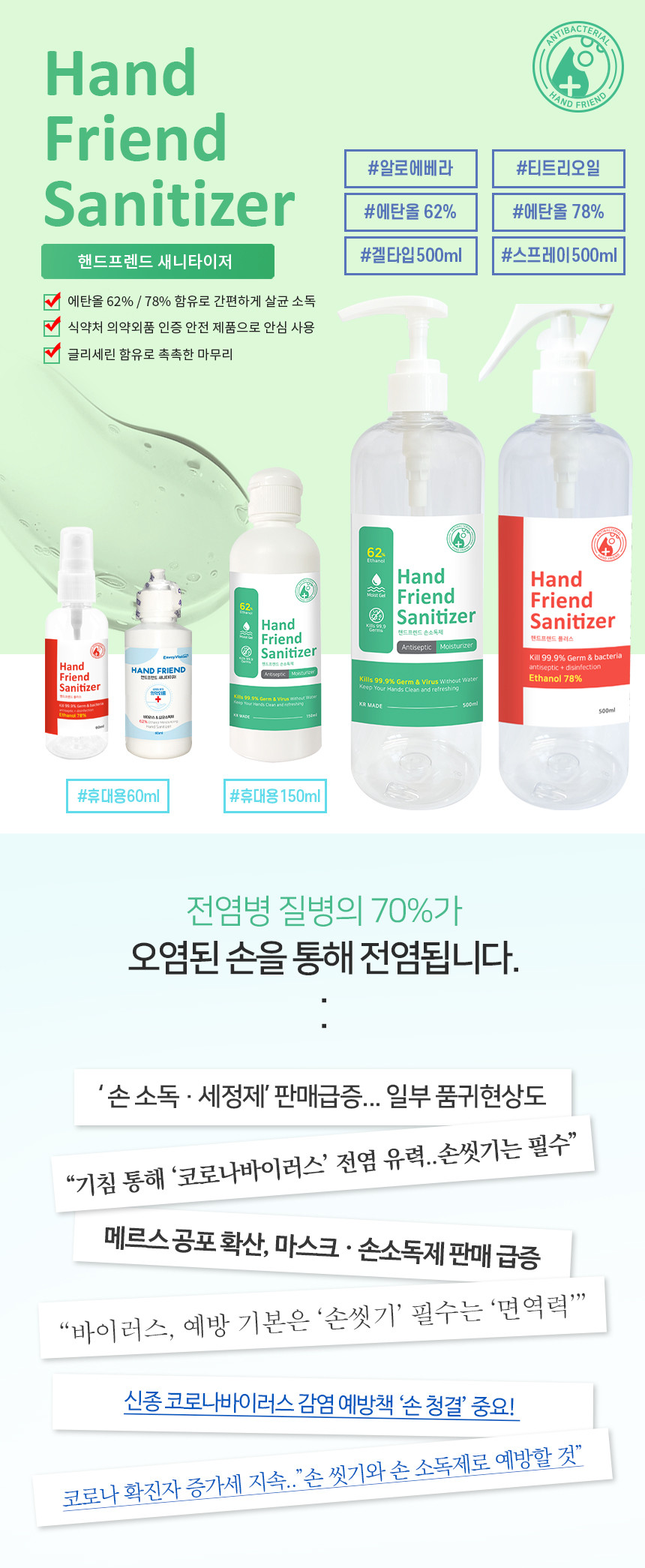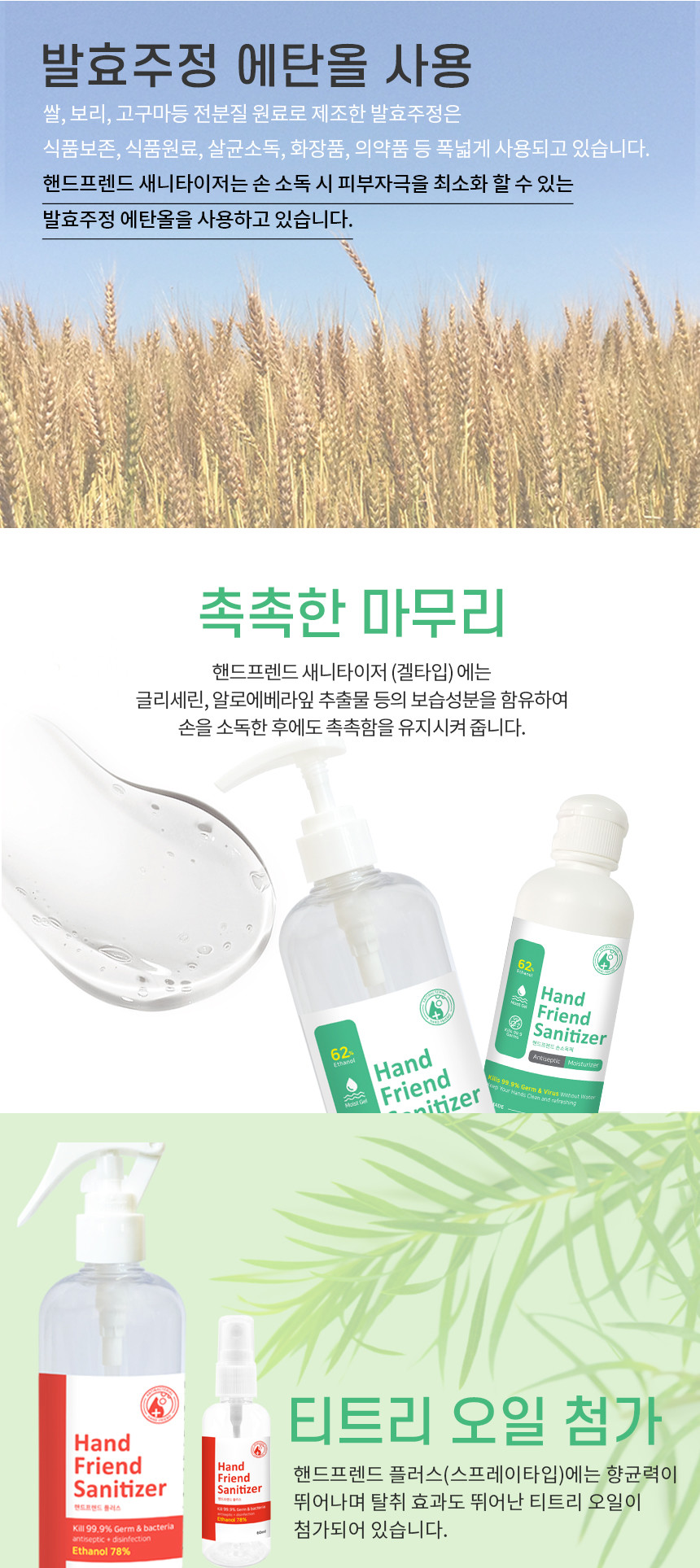 핸드프렌드 플러스 스프레이형 소독제는 식약처 승인을 받은 의약외품이며, 티트리 오일이 함유되어 향균력이 우수하고 알콜 주정 에탄올 함량이 78% 로 솜이나 천에 뿌려서 각종 도구의 소독이 가능한 다용도 소독제입니다.