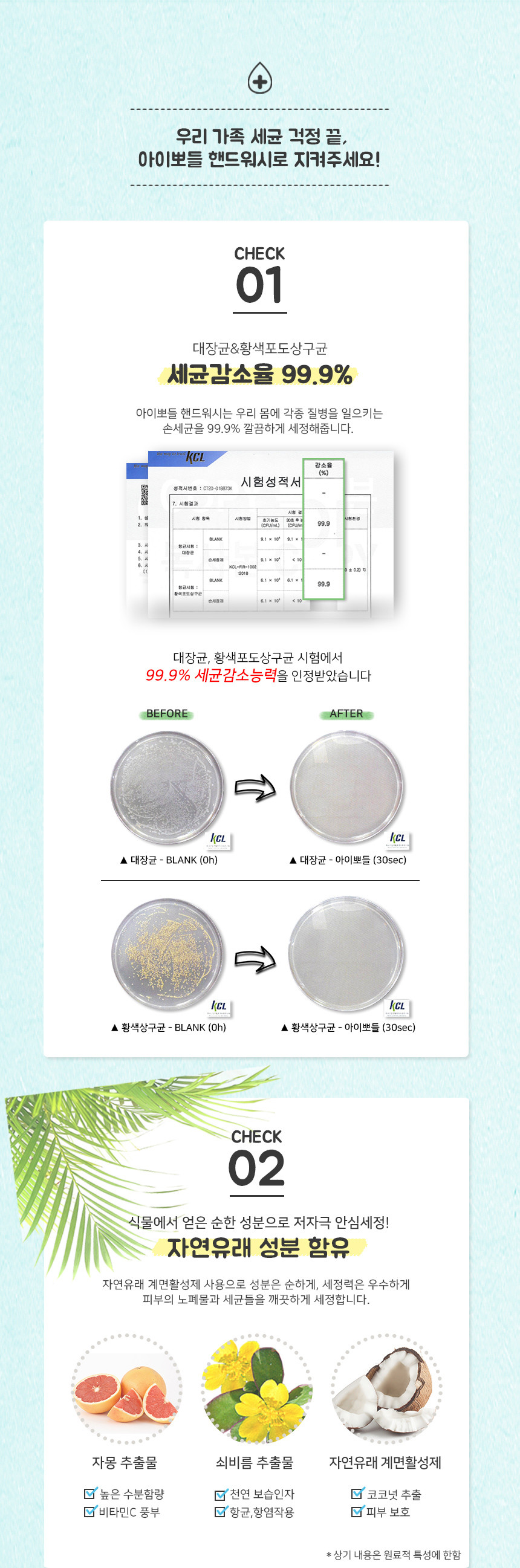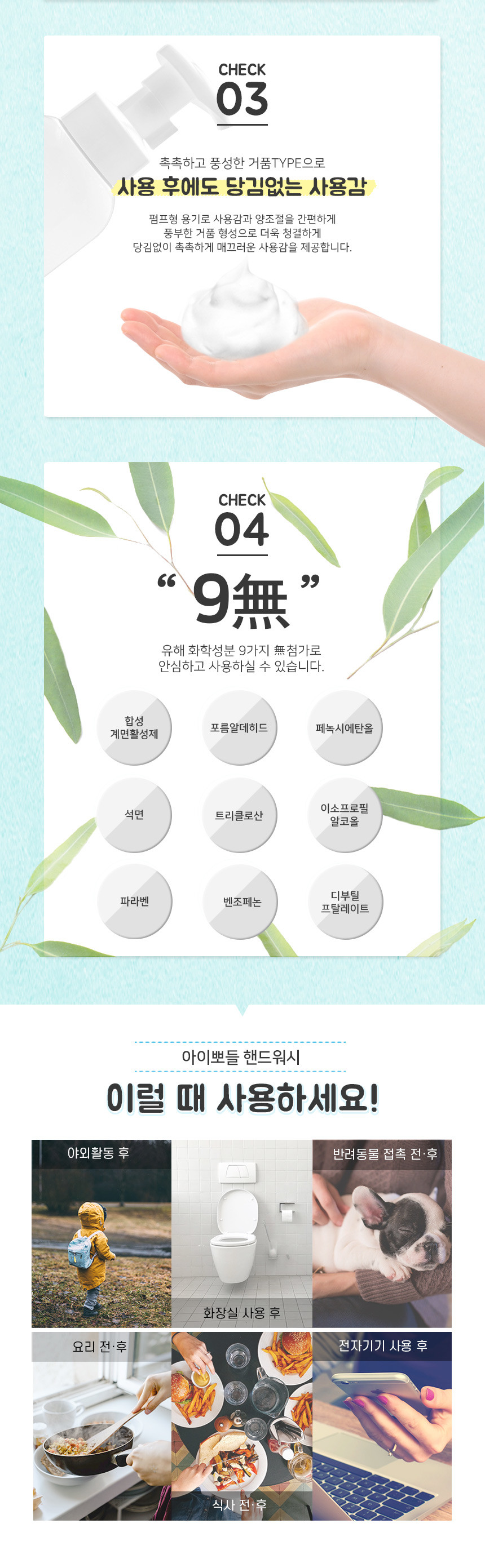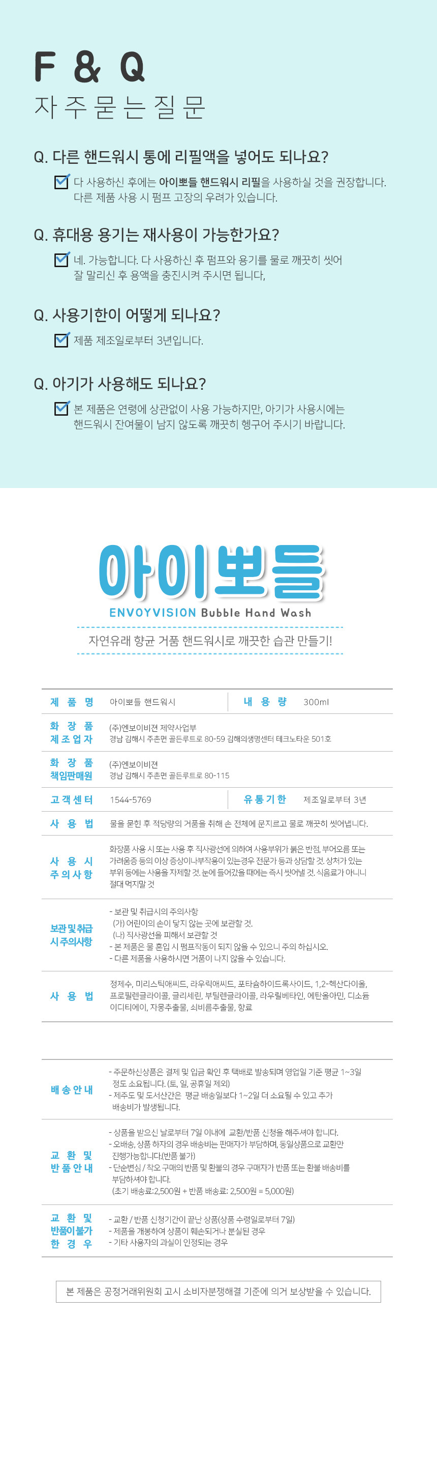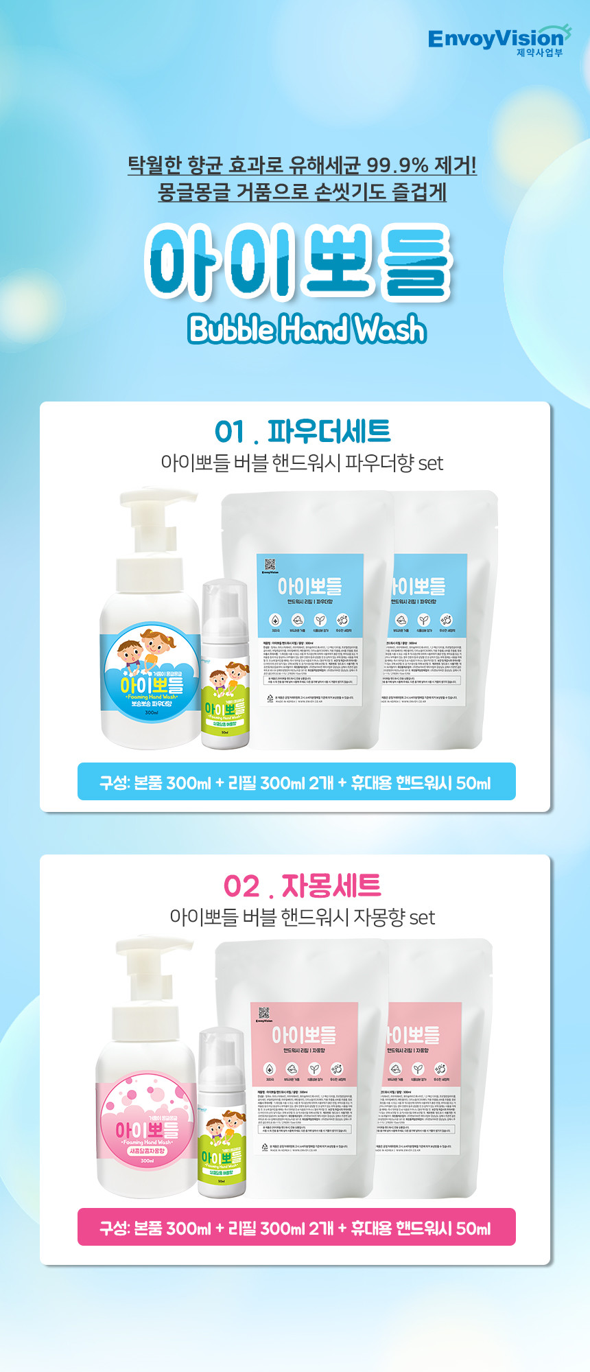 아이뽀들 본품300ml 1개 + 리필300ml 2개 + 휴대용 50ml 1개 구성입니다. 비닐 포장되어 선물용으로도 적합한 상품입니다.
